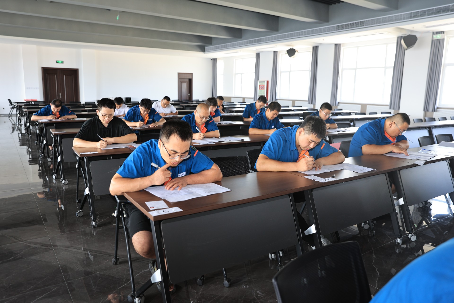 2023年8月25日,福山區“技能興煙”職業技能競賽暨煙臺環球機床裝備股份有限公司第二十四屆員工技能競賽于福潭路廠區4樓報告廳開幕。本次競賽最終舉辦的工種為鉗工,共5家企業,24位選手報名參賽,福山區人社局黨組成員、副局長徐雯斐,福山區總工會黨組成員、副主席劉榮田,公司黨委書記、常務副總經理崔文剛,工會主席陳瑋,企業管理中心副主任王德祥出席本次開幕式。開幕式后,參賽選手進行了緊張的理論考試作答。
